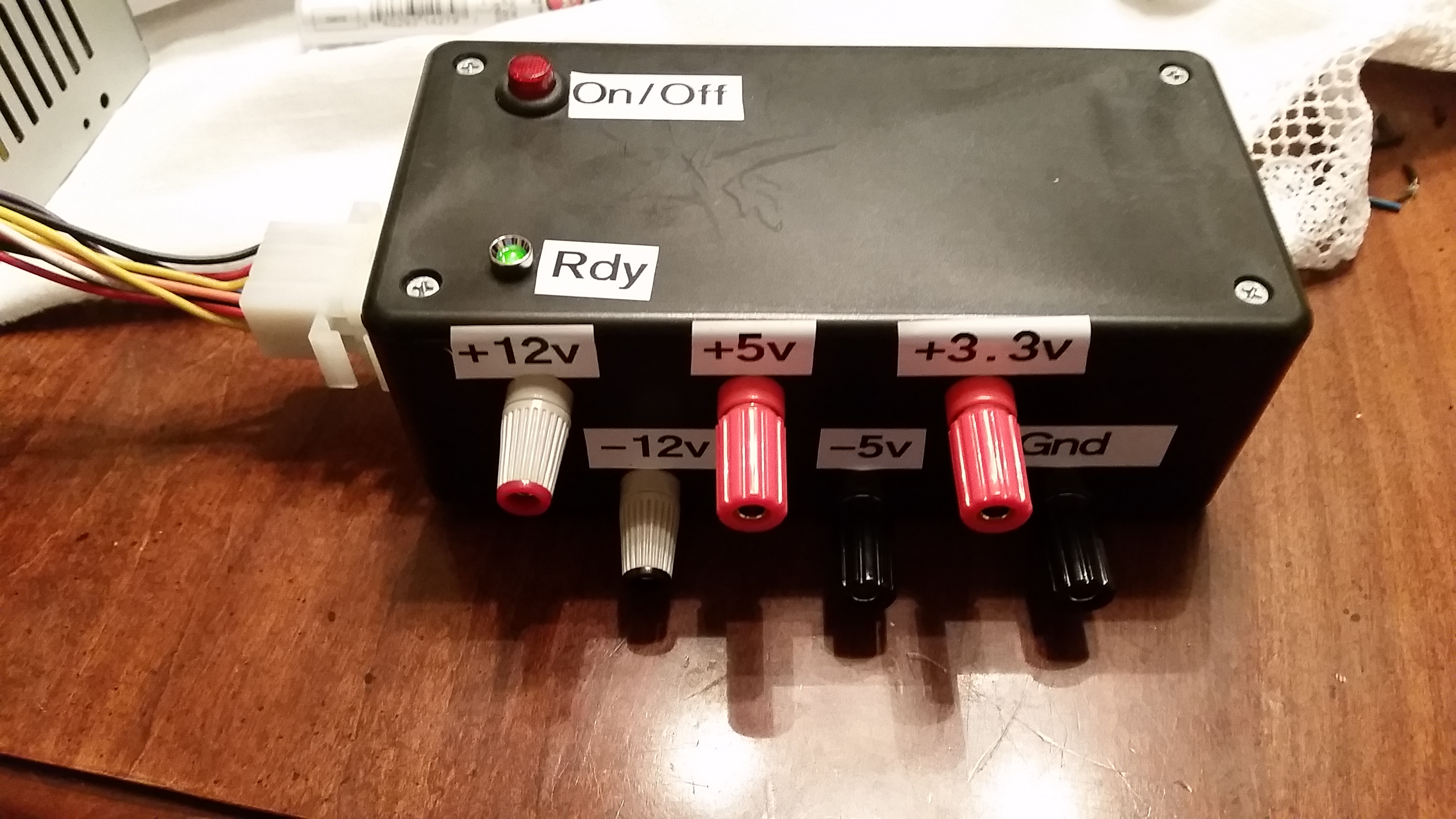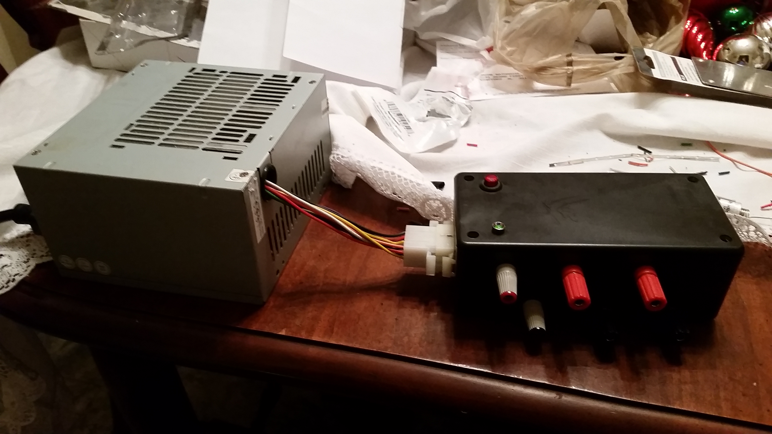 Last night, I modified an old ATX power supply to work as a desktop bench power supply. I basically opened the unit up, removed wiring I did not need, and routed out the wire I did need. Then I ran to a local RadioShack and bought a few things: